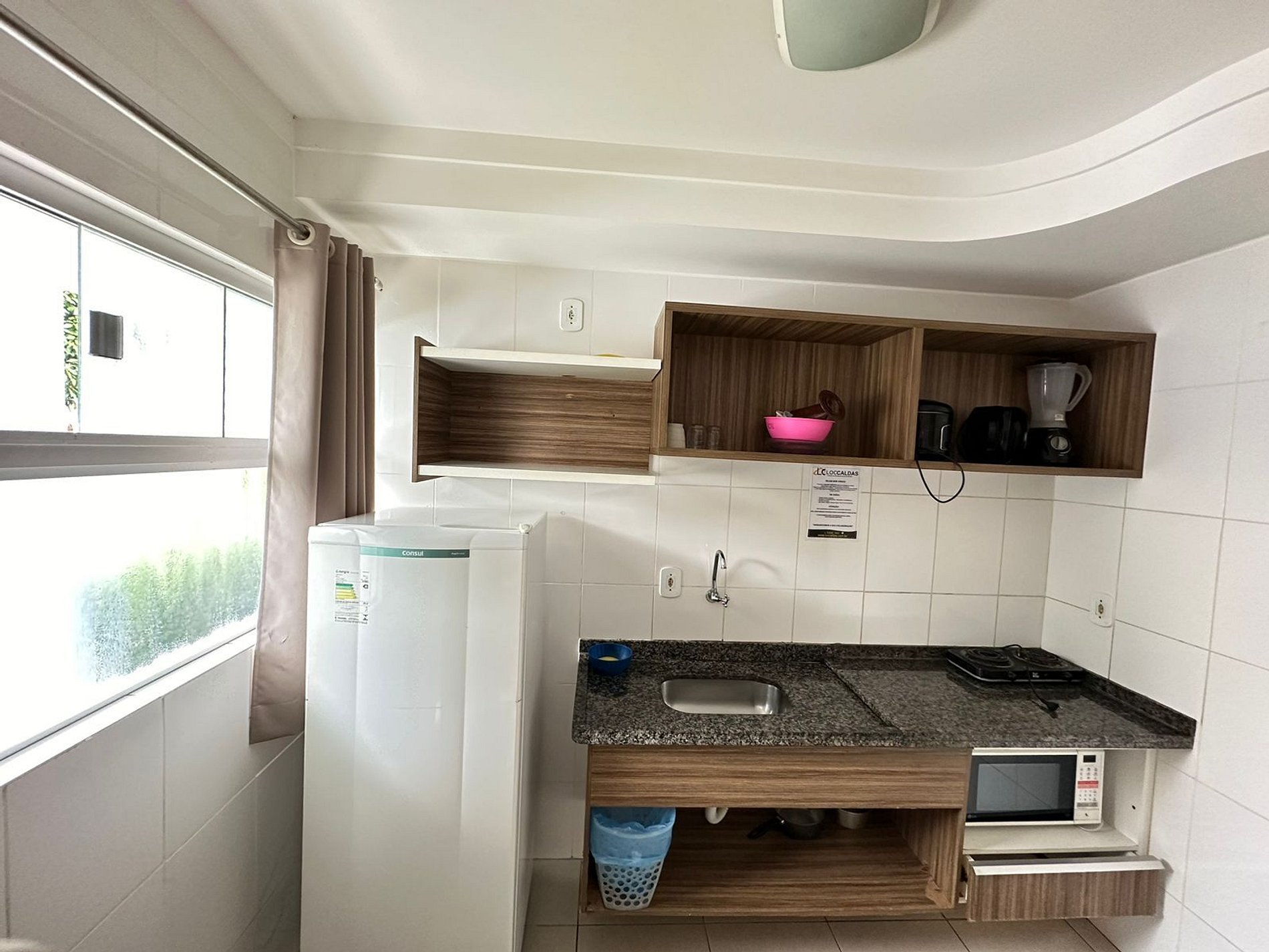 Cozinha compacta com geladeira, microondas, fogão elétrico e utensílios básicos.