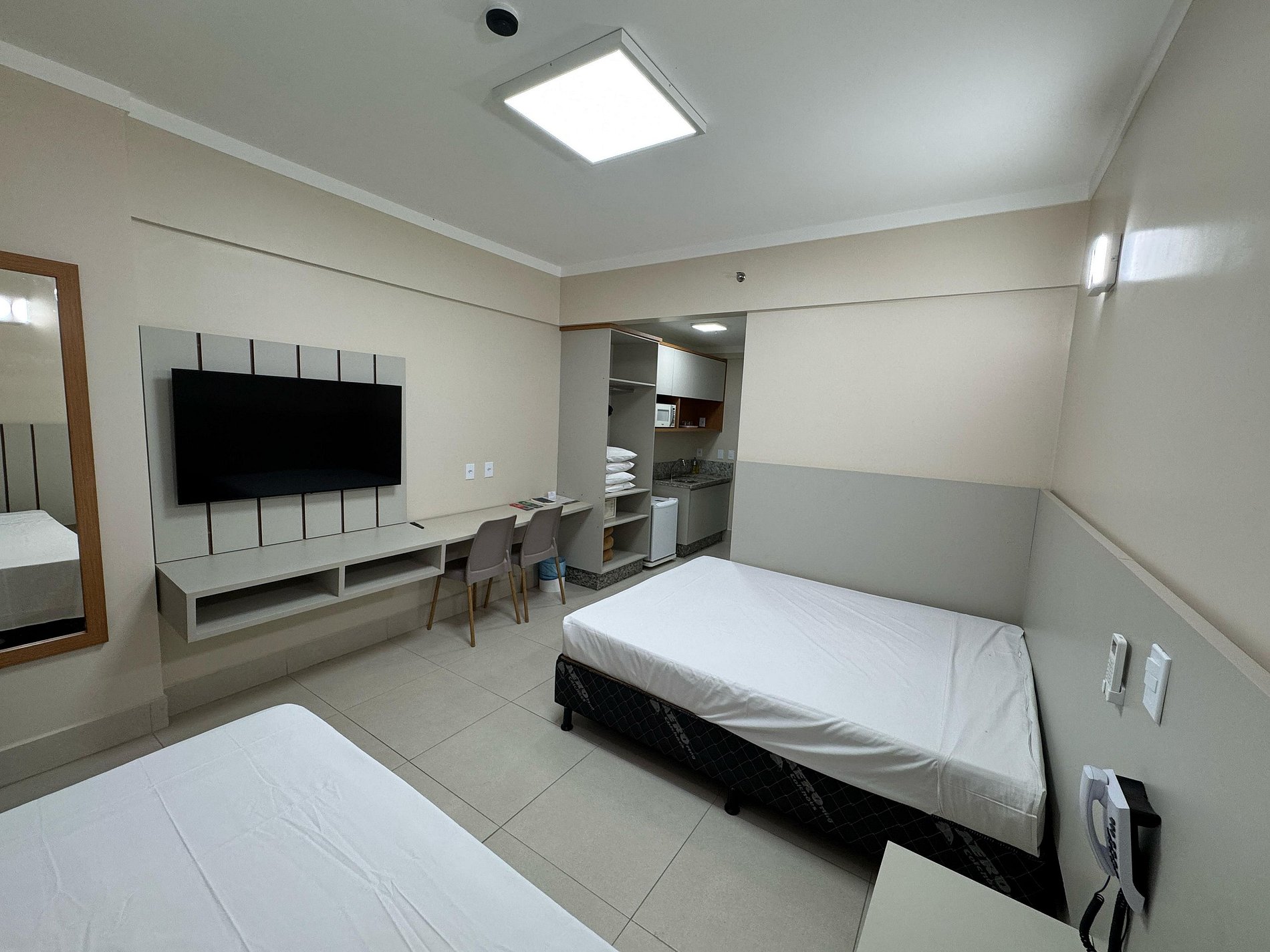 Suite com cama de casal, cama de solteiro com auxiliar, ar condicionado, TV a cabo, geladeira e microondas.
