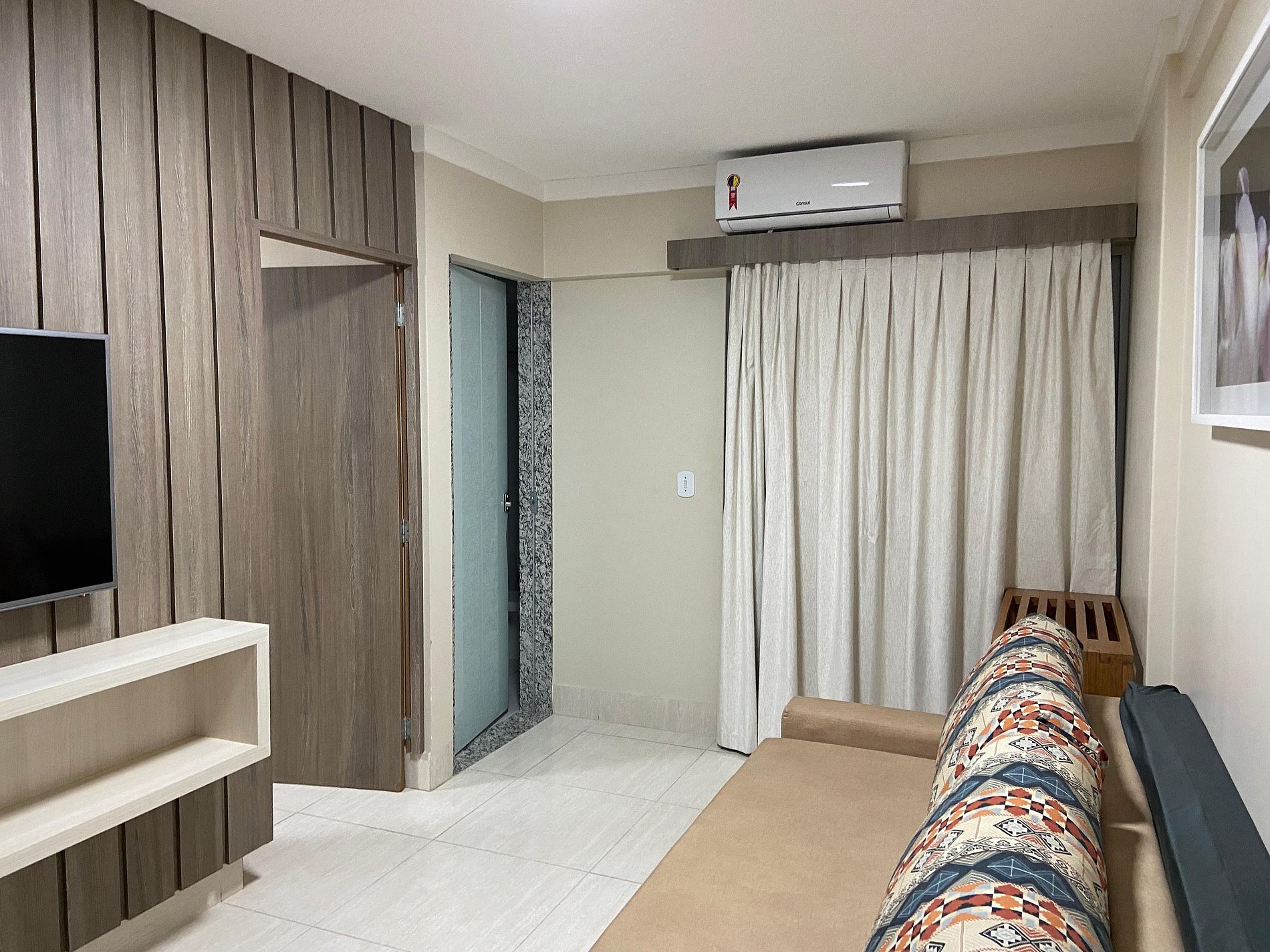 sala com TV, ar condicionado, sofá cama de casal, frigobar, e microondas varanda.